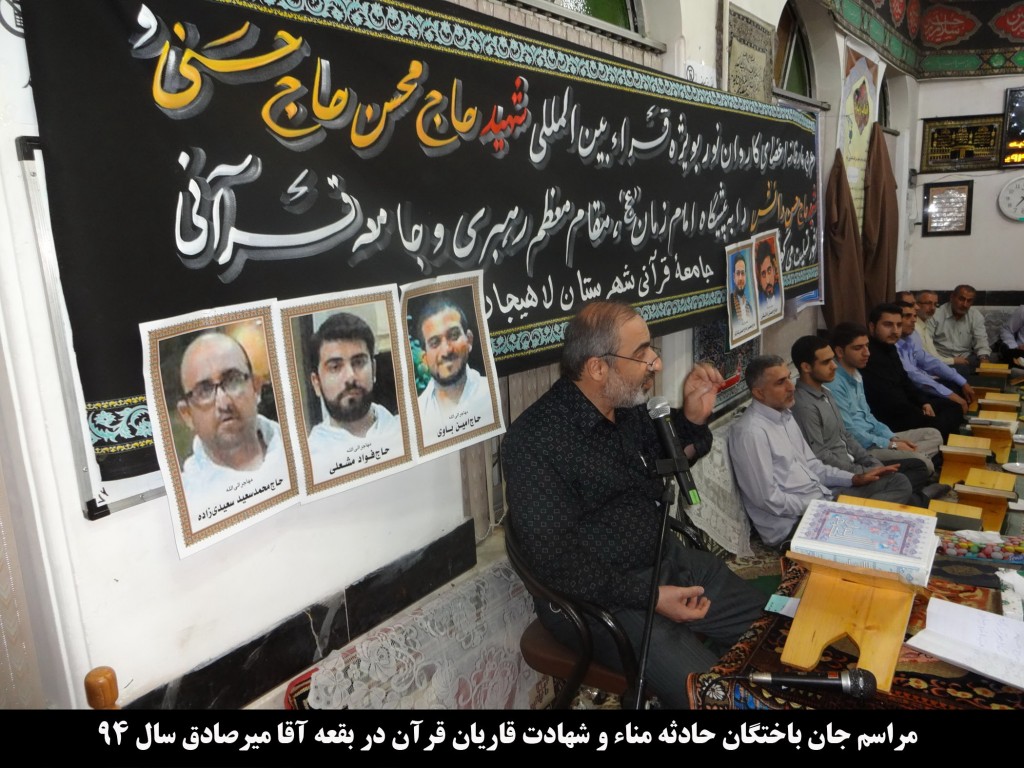 حج ، مهاجران الی الله ، قاریان بین المللی عزیزکشورمان حاج حسن دانش و حاج محسن حاج حسنی کارگر وگروه تواشیح باقرالعلوم خوزستان حاج امین باوی، حاج محمدسعیدسعیدی زاده وحاج فؤادمشعلی برگزار شد. مراسم باسخنان لطفی نیا پیرامون آیه ۱۰۰ سوره مبارکه نساء « ومن یخرج من بیته مهاجرا الی الله …» آغاز گردید ودرادامه ایشان درمورد توصیف نیکوی مقام معظم رهبری از جانباختگان منا باعبارت « مهاجران الی الله » – لزوم برخورد انقلابی وازموضع قدرت نظام جمهوری اسلامی با کارگزاران بی کفایت سعودی (خائنین حرمین شریفین) – ناکارآمدی مناسبات دیپلماتیک درجایی که طرف مقابل رفتارخصمانه ازخودبروزمیدهد و پیگیری تشکیل کمیته حقیقت یاب ازسوی جامعه ملل – عوام رسیدن وقرب اهل قرآن به جایگاه رفیع عزت و شهادت درنزدخداوند تبارک وتعالی وویژگیهای اخلاقی و رفتاری عزیزان قرآنی جان باخته درمنا، سخنانی ایراد کردند سپس یکی از قاریان برجسته استان آیاتی ازکلام الله مجیدرا تلاوت کردند وجلسه با اجرای مراسم نوحه خوانی وسینه زنی توسط مداح اهل بیت (ع) کربلایی محمدحسین اصغری پایان یافت